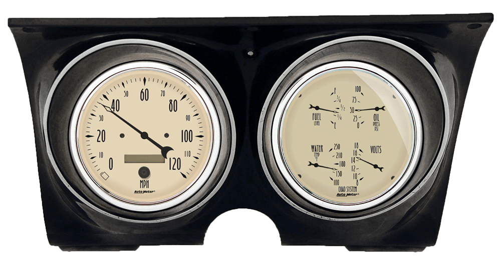 Includes aluminum adapter panels & Auto Meter Antique Beige gauges.