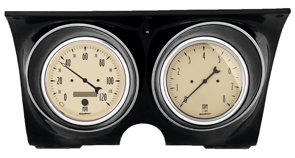 Includes aluminum adapter panels & Auto Meter Antique Beige gauges.