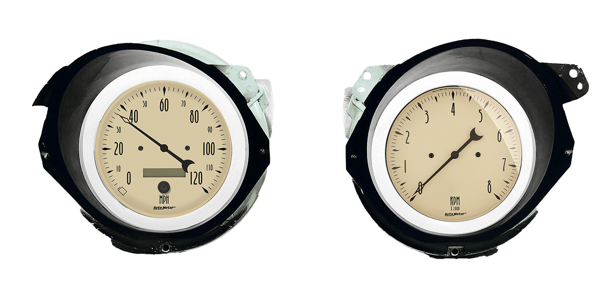 Includes polished aluminum adapter rings & Auto Meter Antique Beige gauges.