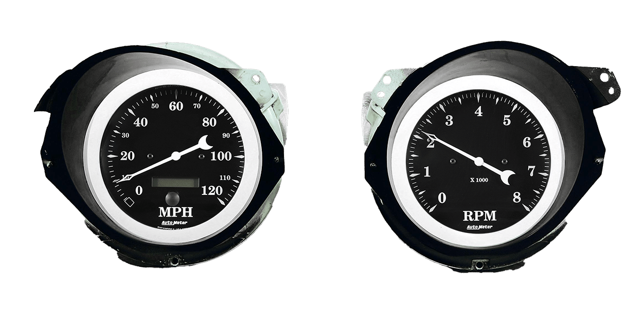 Includes polished aluminum adapter rings & Auto Meter Old Tyme Black gauges.