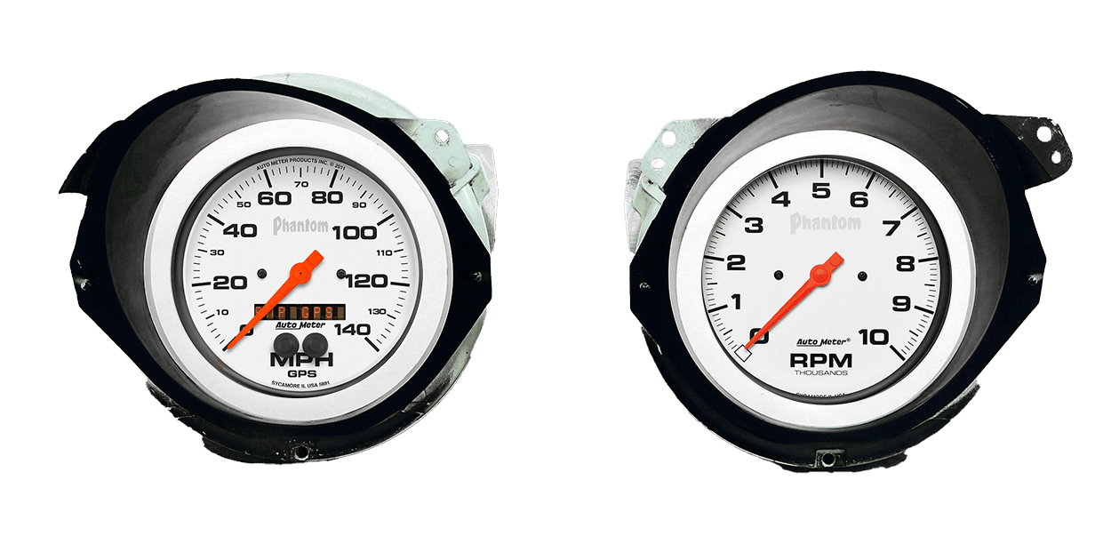 Includes polished aluminum adapter rings & Auto Meter Phantom gauges.