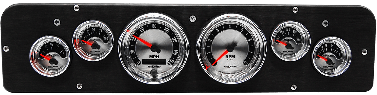 Includes aluminum gauge panel, Auto Meter American Muscle gauges, & LED lights (turn signal & high beam indicators).