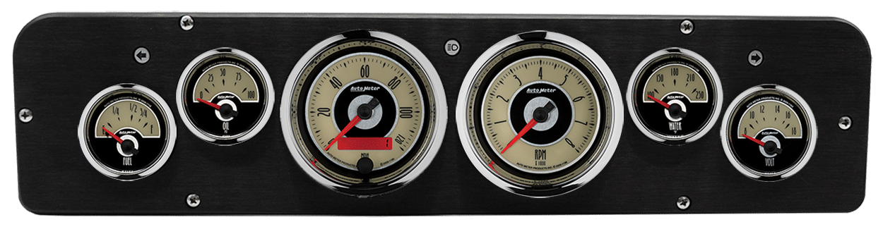 Includes aluminum gauge panel, Auto Meter Cruiser gauges, & LED lights (turn signal & high beam indicators).