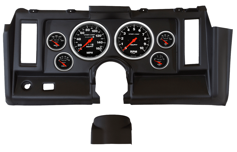 Direct Fit replacement for OEM instrument bezel in 1969 Chevrolet Camaro made from thermoformed UV protected ABS material with Auto Meter Sport-Comp gauges.