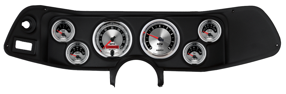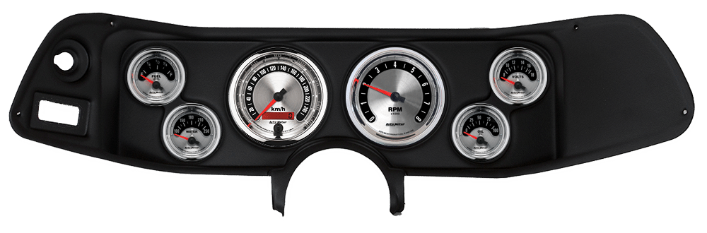 Direct Fit replacement for OEM instrument bezel in 1970-1978 Chevrolet Camaro made from thermoformed UV protected ABS material with Auto Meter American Muscle gauges.