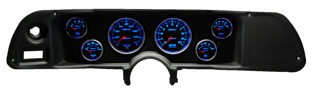 Direct Fit replacement for OEM instrument bezel in 1970-1978 Chevrolet Camaro made from thermoformed UV protected ABS material with Auto Meter Cobalt gauges.