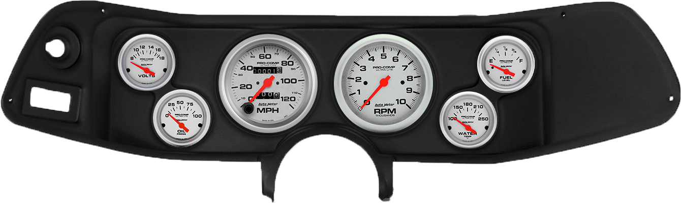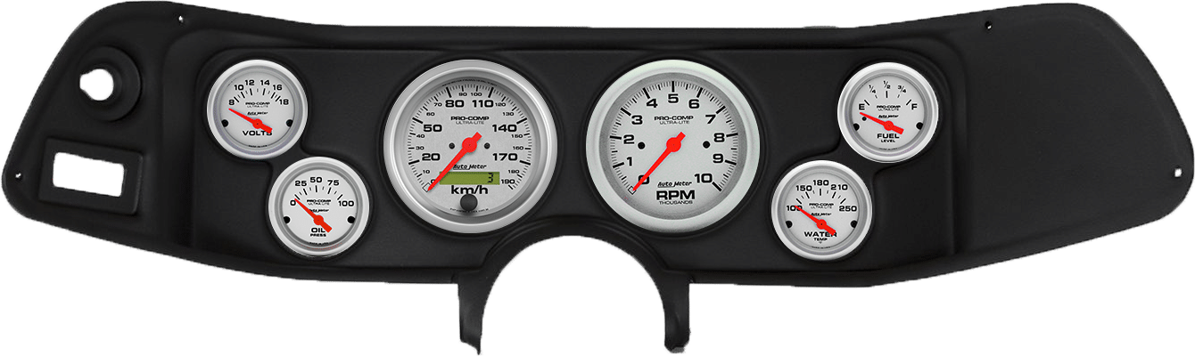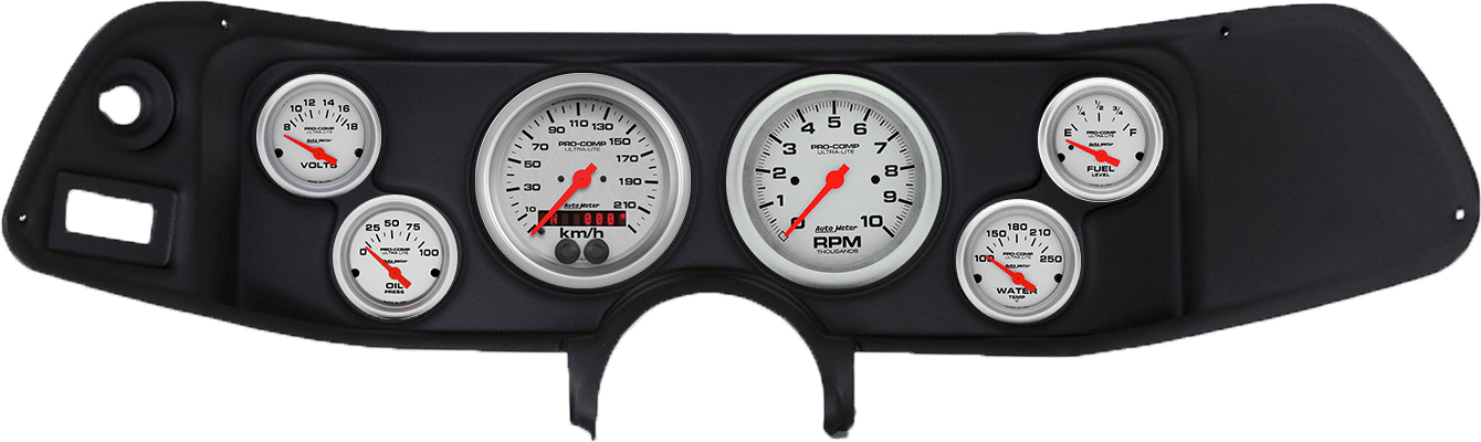 Direct Fit replacement for OEM instrument bezel in 1970-1978 Chevrolet Camaro made from thermoformed UV protected ABS material with AutoMeter Ultra-Lite gauges.