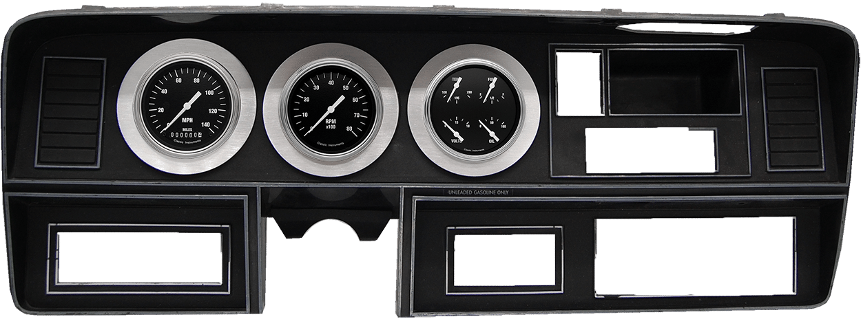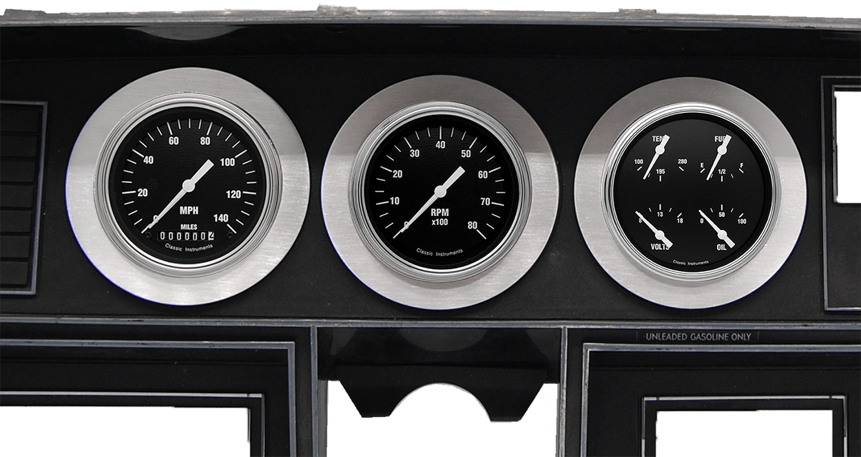 Includes aluminum adapter rings & Classic Instruments Hot Rod gauges
