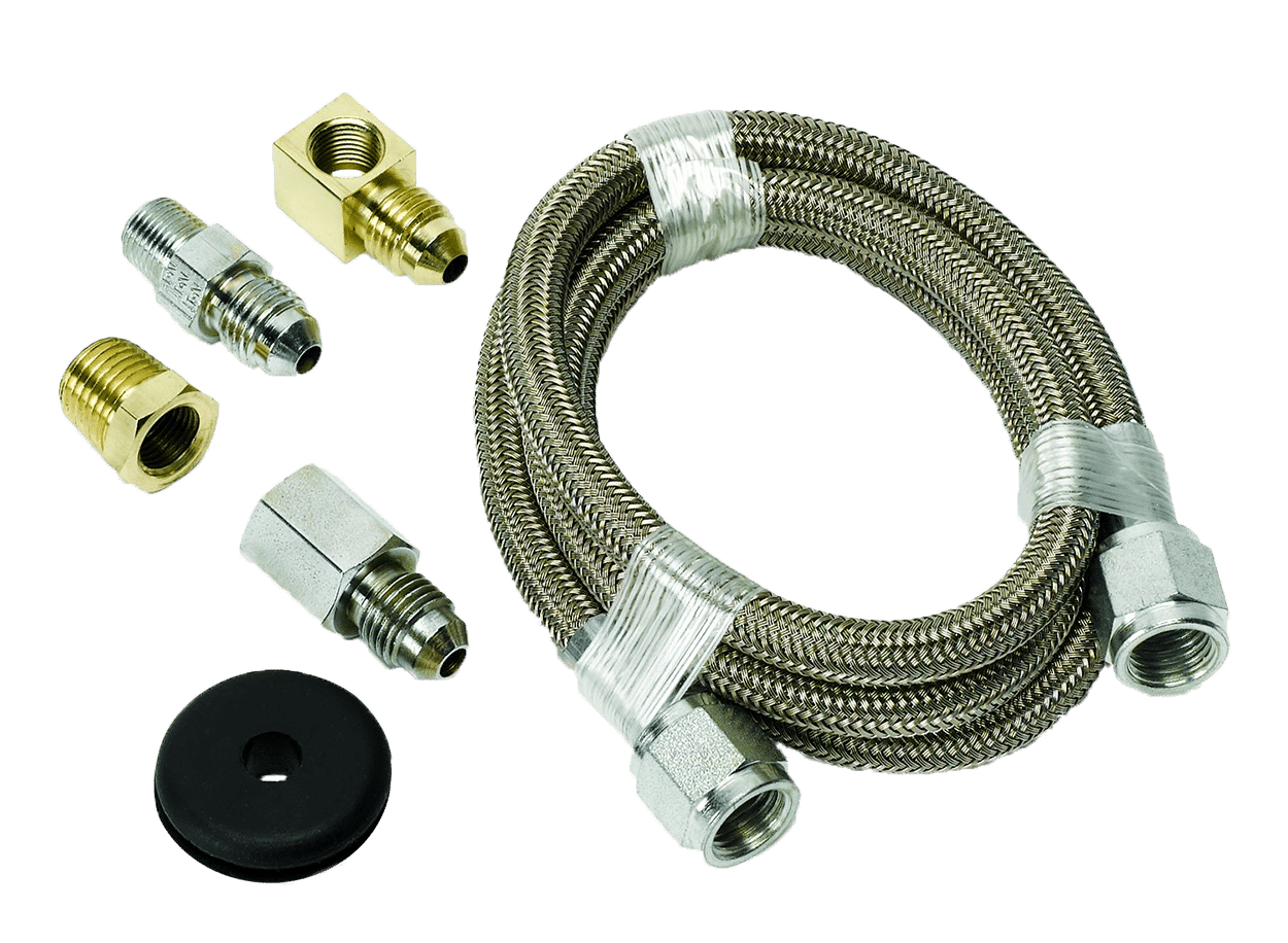 Includes 3ft. of #4 braided stainless steel line, firewall pass through grommet, 1/8″ NPT female right angle to -4AN male fitting, -4AN male to 1/8″ NPT male fitting, -4AN male to 1/8″ NPT female fitting, 1/8″ NPT to 1/4″ NPT adapter bushing. Recommended for use with fuel pressure gauges. For use with mechanical pressure gauges and for remote mounting of electric gauge pressure senders.