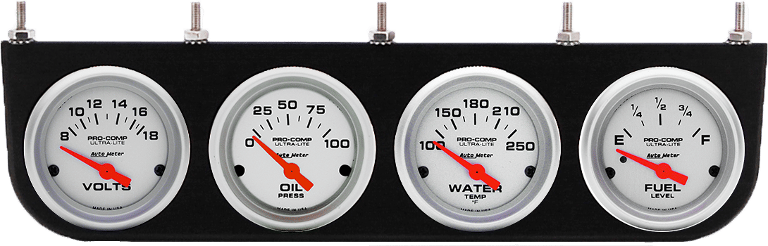 Includes aluminum 4 gauge under dash panel (10.375″ x 2.75″) & 2 1/16″ Auto Meter Ultra-Lite gauges