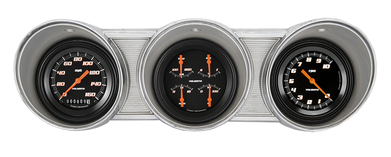 Includes polished aluminum dash insert & Classic Instruments Velocity Black gauges. Gauges include electric speedometer, tachometer, oil pressure, water temperature, voltmeter, & 75-10 ohm fuel gauges. Works with stock fuel tank sending unit. Sending units are Ford motor & transmission. Outside bezel NOT included. Please call us toll free @ 480-968-2550, if you require different sending units for this package.Additional information
