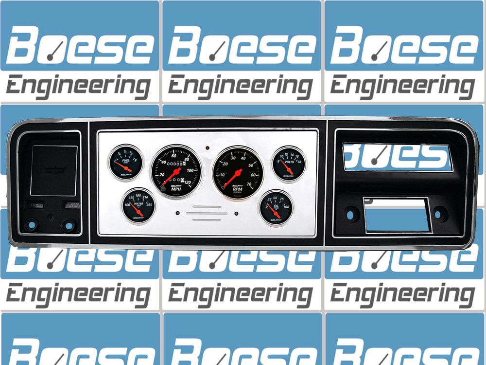 Includes polished aluminum gauge panel, Auto Meter Designer Black gauges, & LED lights. Gauges include mechanical speedometer & electric tachometer, oil, water, volts, & 75-10 ohm fuel (works w/ stock sender). Sending units are included for the oil pressure & water temp. gauges. Cutting required. Stock bezel not included.Additional information