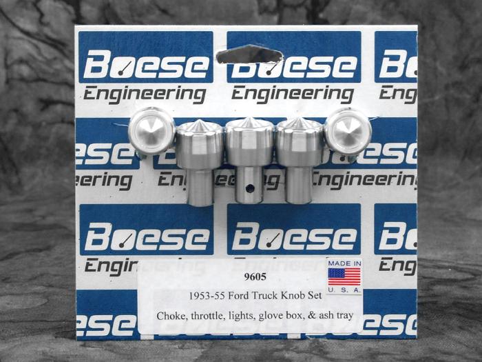 9605 1953-1955 Ford Truck 5 piece billet aluminum dash knob set. Includes choke, throttle, lights, glove box, & ashtray. (machine finish)