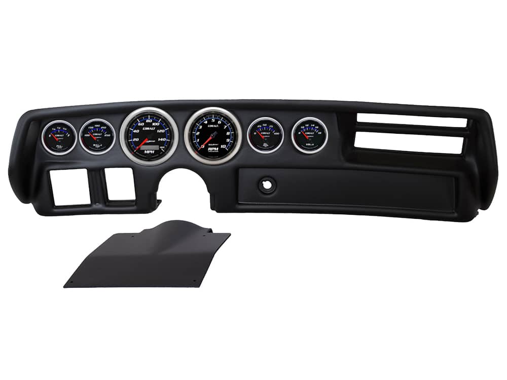 Direct Fit replacement for OEM instrument bezel in 1970-1972 Chevrolet Chevelle, El Camino, Malibu & Monte Carlo Non SS made from thermoformed UV protected ABS material with Auto Meter Cobalt gauges. Gauges include 3 3/8″ electronic speedometer & tachometer, oil, water, volts, & 0-90 ohm fuel. Works with stock speedometer cable & fuel tank sending unit.Additional information