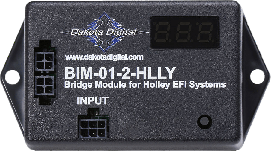 The BIM-01-2-HLLY is designed to read the engine information from the Holley Terminator (including X and X Max), HP, Sniper (except Sniper 2), or Dominator EFI kits. The BIM-01-2-HLLY module is a direct plug in using the supplied 2 or 4 pin harness for simple connection to the Holley EFI system.
