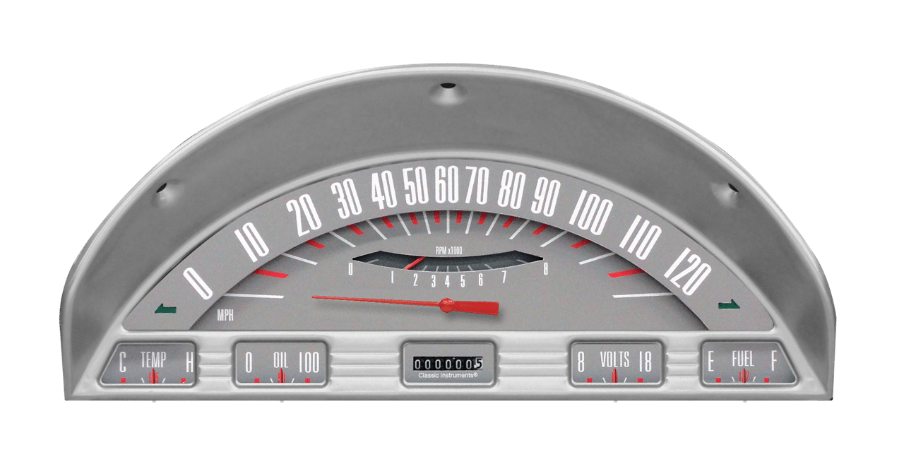 This package is an updated, complete replacement to the original gauges. The electronic cluster features speedometer, tachometer, fuel (75-10 ohms), water temp, oil pressure and volt gauges. Design features include a multi-layer dial design, OE styled graphics, red pointers, original styled green arrow turn indicators, red Halo high beam, LED illumination and easy connector for wiring. As always with Classic Instruments, it is backed by unsurpassed customer service and a 7 year warranty.