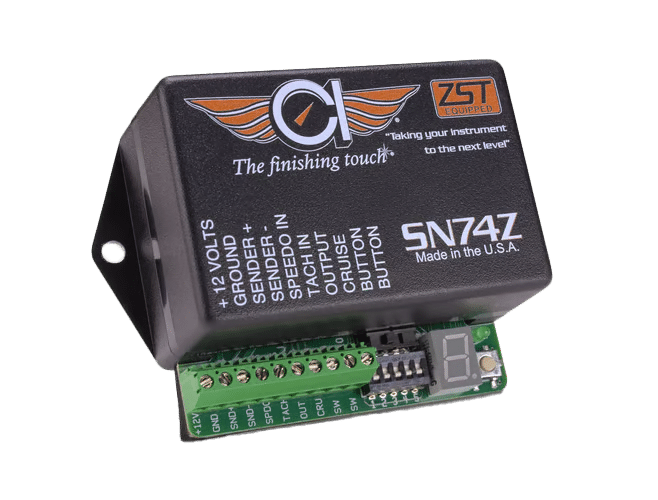 The SN74Z is necessary when using a Classic Instruments speedometer with an Electronic Control Module (ECM) or Vehicle Speed Sensor (VSS) signal. Installs in line between the transmission pulse signal or ECM speed output and your electronic speedometer. Will work with most aftermarket electronic speedometers. Converts all known pulse signals to 16,000 ppm or 8,000 ppm signals and includes an additional 8,000 ppm output signal for cruise control. The SN74Z has the following features when used as a Speedometer interface. Input Source Options Three wire pulse signal generator input source Built-in Vehicle Speed Sensor (VSS) input source Most Tremec transmissions Later model 700R4’s Typically a sine wave signal Two wire pulse signal generator input source Classic Instruments SN96 or SN95 Typically a sine wave signal One wire ECM signals input source Typically a 5 volt square wave Output The output can be selectable between either 8000 pulse per mile or 16000 pulse per mile Outputs a 12V square wave, 50% duty cycle 8000 pulse per mile cruise control output Additional Benefits Three different calibration options Instant: drive 30 MPH and press the calibration button Real-Time: press and the hold the calibration button to match the speedometer reading to the actual vehicle speed Marked Mile: Drive a measured mile to calibrate the speedometer Input signal can range from 2000-200,000 pulses per mile State of the art signal averaging software that ensures smooth pointer operation, even in fluctuating signal conditions. Noise-reducing, filtered power output for powered speedometer signal generators The SN74Z has the following features when used as a Tachometer interface. Input Source Options High Voltage Coil signal input source .5-6 pulses per revolution (1-12 cylinder engine) Typically the negative side of an ignition coil 5-12V Square Wave signal input source .5-6 pulses per revolution (1-12 cylinder engine) 20%-50% duty cycle Typically from an electronic ignition box or computer Inductive Gear tooth sensor input source Typically used in diesel applications where there is not an ignition system The sensor can be mounted to the engine near the flywheel to sense the gear teeth as they rotate by Can be used with 32-510 tooth flywheels, 32-510 pulses per revolution Output Signal output 12V square wave, 50% duty cycle 2, 3, or 4 pulses per revolution (4, 6, or 8 cylinder) 3 preset flywheel tooth settings 148 tooth – Chevy Duramax 152 tooth – 5.9L Cummins 155 tooth – 7.3L Ford Powerstroke